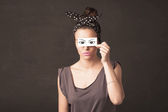 Szczęśliwa dziewczyna patrząc z ręcznie rysowane okulary papierowe oko