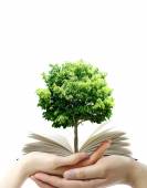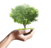 Koncepcja ludzkiej ręki ochrony zielone drzewa. metafora do natury,