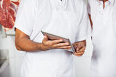 Rzeźników będących w posiadaniu cyfrowej Tablet w sklep mięsny