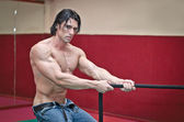 Pewny siebie, atrakcyjny, muskularny młodzieniec bez koszuli z rozerwanym brzuchem i mięśniem brzucha. Na czarnym tle