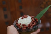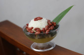 Es Kacang Merah or a cold drink made from red beans boiled with brown sugar served with coconut milk, shaved ice and covered with sweetened condensed milk chocolate and syrup. Indonesian traditional food photo concept.