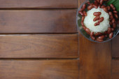 Es Kacang Merah or a cold drink made from red beans boiled with brown sugar served with coconut milk, shaved ice and covered with sweetened condensed milk chocolate and syrup. Indonesian traditional food photo concept.