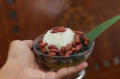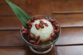 Es Kacang Merah or a cold drink made from red beans boiled with brown sugar served with coconut milk, shaved ice and covered with sweetened condensed milk chocolate and syrup. Indonesian traditional food photo concept.