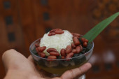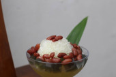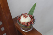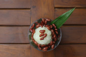 Es Kacang Merah or a cold drink made from red beans boiled with brown sugar served with coconut milk, shaved ice and covered with sweetened condensed milk chocolate and syrup. Indonesian traditional food photo concept.