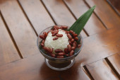 Es Kacang Merah or a cold drink made from red beans boiled with brown sugar served with coconut milk, shaved ice and covered with sweetened condensed milk chocolate and syrup. Indonesian traditional food photo concept.