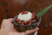 Es Kacang Merah or a cold drink made from red beans boiled with brown sugar served with coconut milk, shaved ice and covered with sweetened condensed milk chocolate and syrup. Indonesian traditional food photo concept.