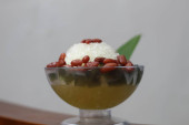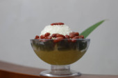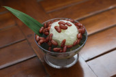 Es Kacang Merah or a cold drink made from red beans boiled with brown sugar served with coconut milk, shaved ice and covered with sweetened condensed milk chocolate and syrup. Indonesian traditional food photo concept.
