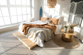 Zdjęcie "Wnętrze sypialni ze składanym ekranem i kreatywnymi dziełami sztuki" może być wykorzystywane do celów osobistych i komercyjnych zgodnie z warunkami zakupionej licencji Royalty-free. Obraz jest dostępny do pobrania w jakości wysokiej rozdzielczości do 5760x3840.