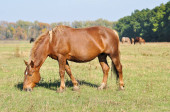 Czerwony zatoce koni arabskich w pastwiska przeciwko drzew z kolorami jesieni