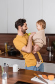 Smiling gay man hugging daughter with apple while partner cooking salad in kitchen