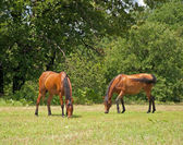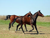 Dwa konie wyścigowe na pastwisku, działa pełną parą