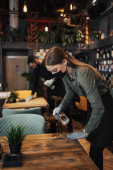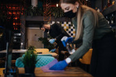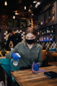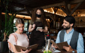 Kelnerka przyjmuje zamówienia od starszego biznesmena z restauracji. Nosi maskę ochronną w ramach środków bezpieczeństwa przed pandemią koronawirusów..
