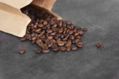 Detailed photo of coffee beans before being processed into a drink isolated on wood. Concept photo of the basic ingredients of coffee drinks.
