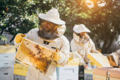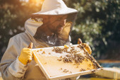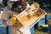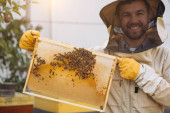 Pszczelarz trzyma komórkę miodu z pszczołami w rękach. Pszczelarstwo. Apiary. Pracujące pszczoły na plastrze miodu. Plaster miodu i pszczół zbliżenie.