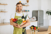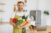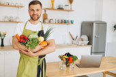 Portret szczęśliwego mężczyzny trzymającego talerz świeżych warzyw na tle kuchni w domu