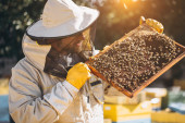 Zdjęcie "Pszczelarz trzyma komórkę miodu z pszczołami w rękach. Pszczelarstwo. Apiary. Pracujące pszczoły na plastrze miodu. Plaster miodu i pszczół zbliżenie." może być wykorzystywane do celów osobistych i komercyjnych zgodnie z warunkami zakupionej licencji Royalty-free. Obraz jest dostępny do pobrania w jakości wysokiej rozdzielczości do 5760x3840.