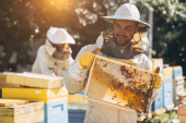 Pszczelarz trzyma komórkę miodu z pszczołami w rękach. Pszczelarstwo. Apiary. Pracujące pszczoły na plastrze miodu. Plaster miodu i pszczół zbliżenie.