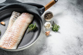 Grilled sea bass fillet with lime and thyme. Black background. Top view.