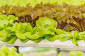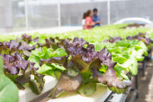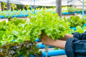 Azjatycki rolnik trzyma zieloną sałatę w szklarni ekologicznej