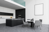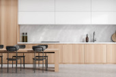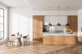 Zdjęcie "Drewniane wnętrze kuchni ze stołem jadalnym i krzesłami na drewnianej podłodze, widok z boku, miejsce do gotowania z wyspy bar. Luksusowa kuchnia z nowoczesnymi meblami, renderowanie 3D" może być wykorzystywane do celów osobistych i komercyjnych zgodnie z warunkami zakupionej licencji Royalty-free. Obraz jest dostępny do pobrania w jakości wysokiej rozdzielczości do 5760x3840.