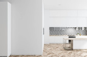 Drewniane wnętrze kuchni ze stołem jadalnym i krzesłami na drewnianej podłodze, widok z boku, miejsce do gotowania z wyspy bar. Luksusowa kuchnia z nowoczesnymi meblami, renderowanie 3D