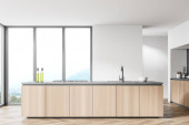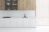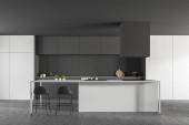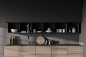 Wnętrze minimalistycznej kuchni z szarymi ścianami, ciemnodrewniana podłoga, szare szafki z wbudowanym zlewem i kuchenką oraz drewniana szafka. 3d renderowanie