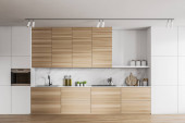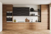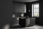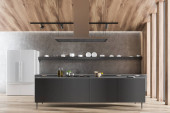 Zdjęcie "Wnętrze minimalistycznej kuchni z szarymi ścianami, ciemnodrewniana podłoga, szare szafki z wbudowanym zlewem i kuchenką oraz drewniana szafka. 3d renderowanie" może być wykorzystywane do celów osobistych i komercyjnych zgodnie z warunkami zakupionej licencji Royalty-free. Obraz jest dostępny do pobrania w jakości wysokiej rozdzielczości do 5760x3840.