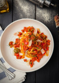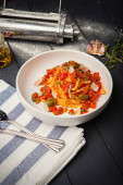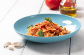Makaron łukowy uzupełniony sosem bolońskim i bazylią