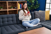 Zdjęcie "Young beautiful woman watching video on touchpad sitting on sofa at home" może być wykorzystywane do celów osobistych i komercyjnych zgodnie z warunkami zakupionej licencji Royalty-free. Obraz jest dostępny do pobrania w jakości wysokiej rozdzielczości do 5760x3840.