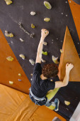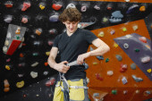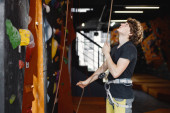 Instruktor wspinaczki wspina się na sztuczne skały na ścianie. Kędzierzawy człowiek pracujący jako instruktor. Mężczyzna w czarnej koszulce.