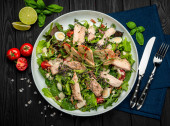 Sałatka z bakłażanem w cieście i smażone grzyby eringi. Zdrowa i smaczna koncepcja żywności