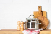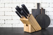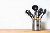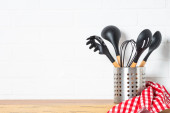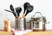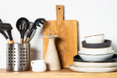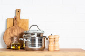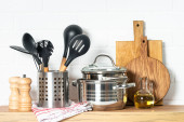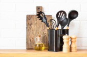 Kitchen utensils. Cooking tools with wooden cutting boards, oil and shaker at white modern kitchen interior.