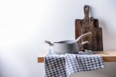 Kitchen table with kitchen utensils, cooking pots, oil bottle with wooden cutting board, white modern interior.