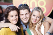 szczęśliwy grupa przyjaciół śmiechem, doping i macha