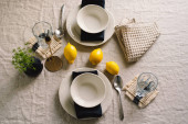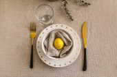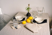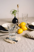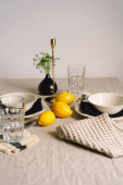 Vintage table setting with Linen napkins and yellow lemons. Decoration table. Close up. Cozy calm meal in the morning in the sunshine.