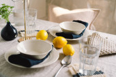 Zdjęcie "Vintage table setting with Linen napkins and yellow lemons. Decoration table. Close up. Cozy calm meal in the morning in the sunshine." może być wykorzystywane do celów osobistych i komercyjnych zgodnie z warunkami zakupionej licencji Royalty-free. Obraz jest dostępny do pobrania w jakości wysokiej rozdzielczości do 5760x3840.