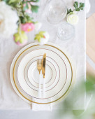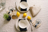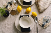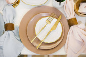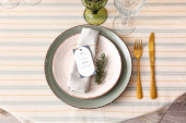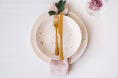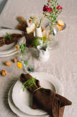 Vintage table setting with Linen napkins and floral decorations. Close up. Cozy calm meal in the morning in the sunshine.