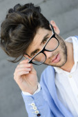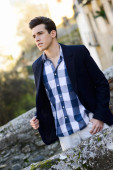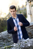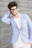 atrakcyjny młody przystojny mężczyzna, model moda w miejskich backgro