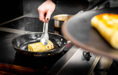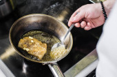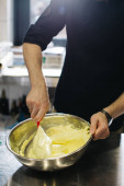 Proces robienia ganache, wypełnienie dla rogalika pistacjowego. Krem wpływa na białą czekoladę..