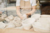 Zamknij drzwi. Kucharz ugniata ciasto rękami, robiąc makaroniki lub ciasta..