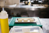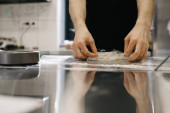 Zamknij drzwi. Kucharz owija ciasto folią klejącą i znakuje markerem. Wytwarzanie makaronów lub ciast.