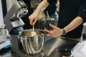 Zdjęcie "Zamknij drzwi. Kucharz owija ciasto folią klejącą i znakuje markerem. Wytwarzanie makaronów lub ciast." może być wykorzystywane do celów osobistych i komercyjnych zgodnie z warunkami zakupionej licencji Royalty-free. Obraz jest dostępny do pobrania w jakości wysokiej rozdzielczości do 5760x3840.