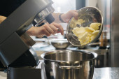 Zdjęcie "Zamknij drzwi. Kucharz w kuchni kawiarni lub piekarni. Samice łamią jaja dla ciasta.." może być wykorzystywane do celów osobistych i komercyjnych zgodnie z warunkami zakupionej licencji Royalty-free. Obraz jest dostępny do pobrania w jakości wysokiej rozdzielczości do 5760x3840.