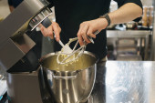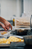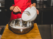 Szef kuchni pracuje w kuchni. Proces wytwarzania ciasta dla makaronów.