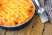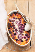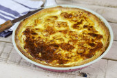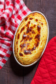 Zapiekanka z serem wiejskim w owalnej ceramicznej formie na drewnianym tle. Styl rustykalny, ostrość selektywna.