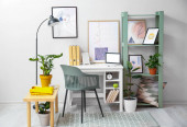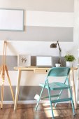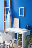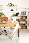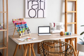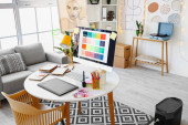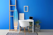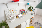 Interior of modern atelier with tailor's workplace, shelves and surfboard