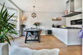 Zdjęcie "kuchnia i jadalnia w domu z niebieskimi ścianami, drewnianą podłogą i białymi szafkami po obu stronach" może być wykorzystywane do celów osobistych i komercyjnych zgodnie z warunkami zakupionej licencji Royalty-free. Obraz jest dostępny do pobrania w jakości wysokiej rozdzielczości do 5760x3840.