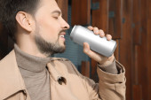 Szczęśliwy człowiek pijący z puszki na jasnoszarym tle. Miejsce na tekst