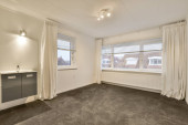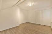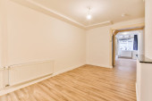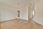 pusty salon z drewnianą podłogą i białymi ścianami, jest lustro na ścianie nad nim