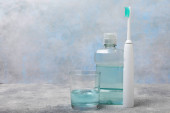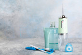 Zdjęcie "Elektroniczna szczoteczka do zębów, płyn do płukania ust, nici dentystyczne, czyszczący język i pasta do zębów na niebieskim tle teksturowanym. Przedmioty do opieki stomatologicznej i profilaktyki próchnicy w łazience. Koncepcja dentystyczna. Przestrzeń kopiowania." może być wykorzystywane do celów osobistych i komercyjnych zgodnie z warunkami zakupionej licencji Royalty-free. Obraz jest dostępny do pobrania w jakości wysokiej rozdzielczości do 5760x3840.